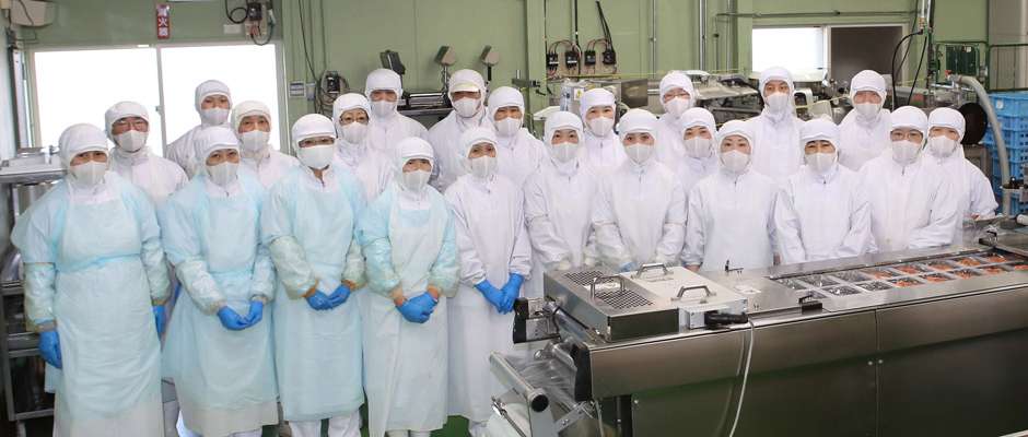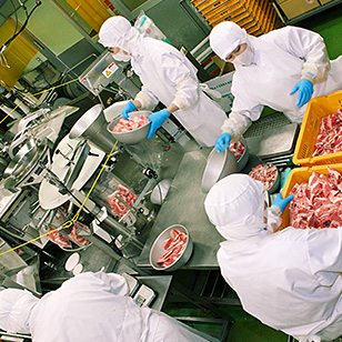 食肉ライン、調味肉ライン、惣菜ライン、安全な商品を確かめる検査部門に分かれています。